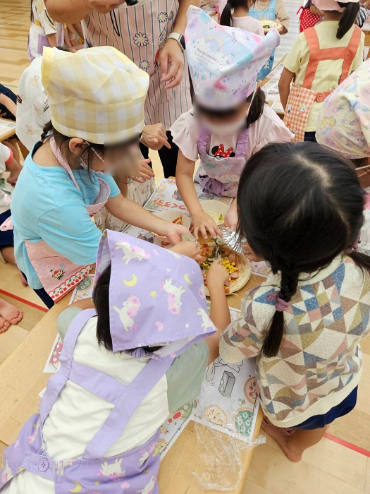 10月16日に 3歳児さん、4歳児さん、5歳児さんのみんなで ピザ作りに挑戦しました。