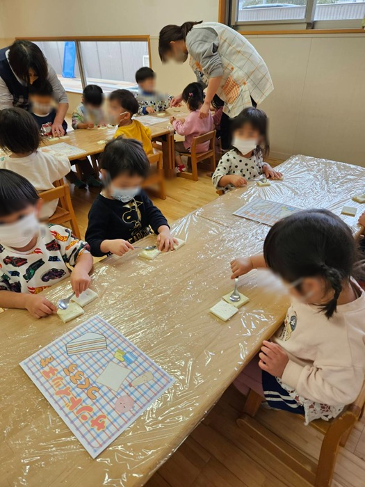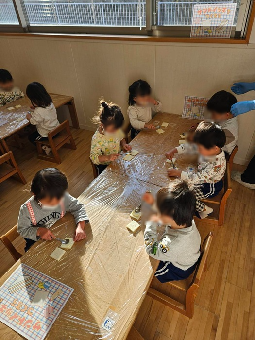 はじめはお昼寝後で、少し眠そうにしていた子どもたちでしたが、 作り始めると集中してスプーンを上手に使って食パンにマヨネーズを塗り広げていました。その上にハムとチーズをのせて挟んでサンドイッチを作りました。