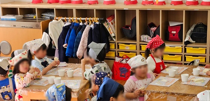 12月12日、2歳児(たんぽぽ組)さんと 3歳児(ゆり組) さんが「サンドイッチ」作りに挑戦しました。