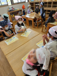 1月16日は、5歳児(すみれ組)さんが、手作りのバター作りに挑戦しました。 はじめに、バターがどのように出来るのか説明を聞いてから 生クリームと少量の塩を入れて冷蔵庫で冷やしておいたボトルを上下に振ってバターを作りました […]