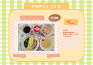 給食の栄養士が提供している給食に合わせたおすすめの夕食献立を考えました。 日付 献 立 名 (材料) 2/16(月) ・いかと大根のエビチリ (えび/いか/大根/塩/砂糖/片栗粉/ケチャップ/酢/醤油/豆板醤/胡椒 […]