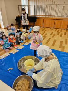 2月26日に うめ組(4歳児)・すみれ組 (5 歳児)さんが、味噌づくりに挑戦しました!! 子ども達に味噌の作り方を説明し、煮てミンチにした大豆・米麹・塩を使って味噌作りました。はじめに、大豆・米麹・塩を混ぜるところを子 […]
